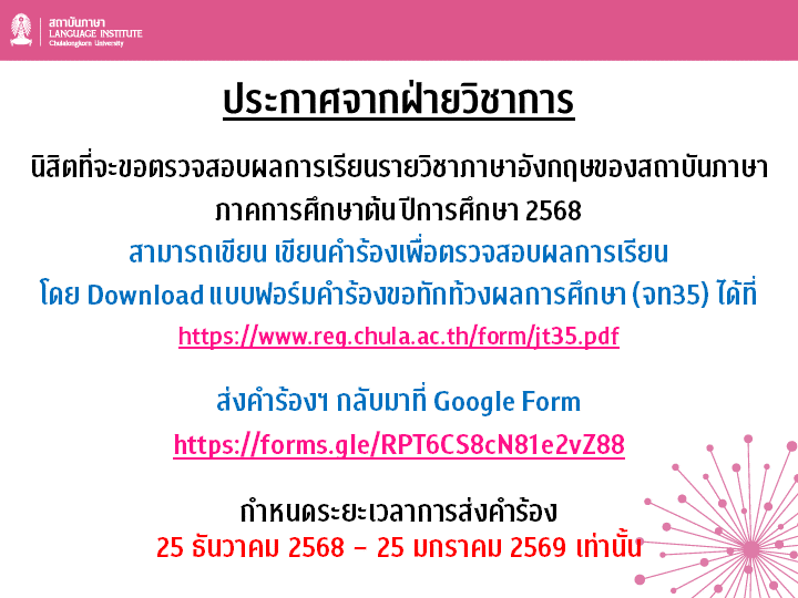 รายละเอียดภาษาอังกฤษวิชาเลือกสำหรับนิสิตระดับปริญญาบัณฑิต (Elective English) ประจำภาคปลาย ปีการศึกษา 2568